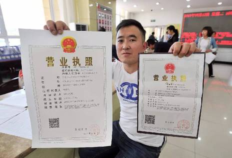 2015年5月12日,在宁夏贺兰县政务大厅,一名经营业主展示刚刚领到的“三证合一”营业执照。新华社记者 彭昭之 摄
