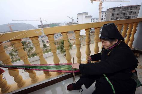 2014年1月9日,一名老人在贵州省丹寨县扬武乡扶贫生态移民安置区的敬老院内纺织编织锦带。新华社记者 陶亮 摄