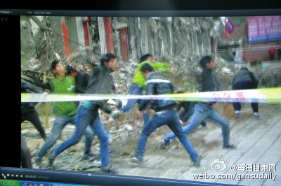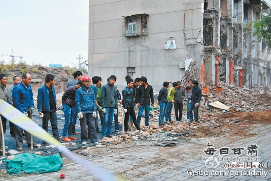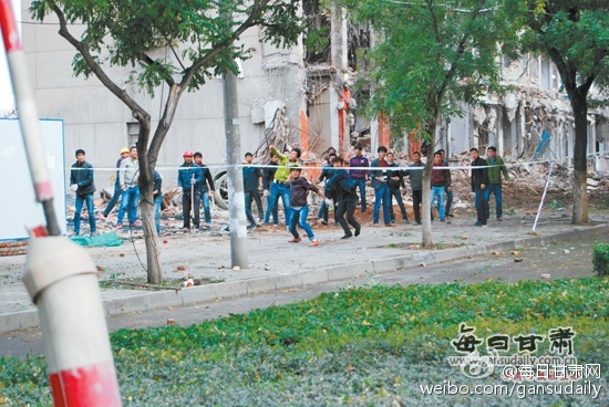 10月26日,位于兰州市土门墩第一建设股份公司木材厂家属院拆迁现场,在没有完全达成一致拆迁协议情况下,东联拆迁公司强行拆迁,同时派来数十名青年男子向家属院住户和木材厂员工发动“砖头攻势”。一阵“砖头雨”后,11人被砸得头破血流,其中一人伤势严重。记者从视频上看到,拆迁队先在拆迁现场拉起了警戒线,然后几台挖掘机开始了拆迁。警戒线内,大约20名青年男子站在一堆砖头前。距警戒线数米外,住户和员工闻讯赶到,一些人手中拿着木棍,双方发生了争执。
