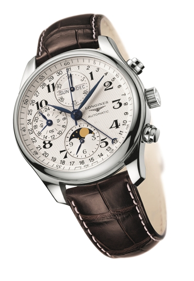 浪琴表名匠系列精钢月相计时腕表,皮表带(参考价:RMB 25000)