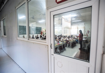 燕郊汇福实验学校,学生们在彩钢板搭起的简易房内上课。