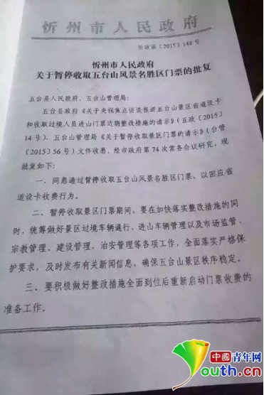 近日,网上流传一份《忻州市人民政府关于暂停收取五台山风景名胜区门票的批复》(忻政函〔2015〕148号文件),该文件称,为回应央视《焦点访谈》关于五台山风景名胜区省道设卡和收取过境人员进山门票的报道,同意五台山管理局暂停收取五台山风景名胜区门票,待整改措施全面到位后重新启动门票收费。