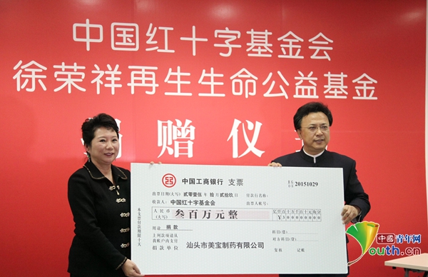 中国青年网北京10月29日电(记者李延兵)2015年10月29日,中国红基会的“徐荣祥再生生命公益基金”正式成立。中国红十字会副会长、中国红基会理事长郭长江,中国红基会副理事长刘选国,美国徐荣祥基金会主席李俐,美宝国际董事局主席徐鹏及徐荣祥先生生前挚友出席了此次捐赠仪式。基金由徐荣祥创立的北京美宝烧伤创疡研究所发起、设立。
