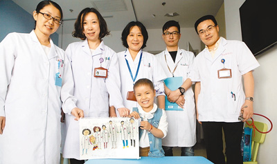上海儿童医院血液科的医生办公室贴着一幅儿童画,画面上血液科6位医生的神态样貌惟妙惟肖,画中的小朋友旁写着“查清月”,画的下方写着“谢谢你们给我治好病”。“越看越发现这幅画抓住了我们各自的特征,相似度达到90%。”画中6位治疗医生之一的叶启东医生说,“查清月患肝母细胞瘤住院一年多,接受了9期的化疗治疗,效果非常明显。目前已经出院,进入随访阶段。”