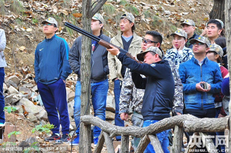 2015年10月29日,山东省日照市五莲县黑虎山狩猎场,参加体验狩猎的嘉宾们,在导猎人员的陪同深入猎场,真枪实弹的狩猎。山东黑虎山狩猎场邀请了全国各地50多家知名旅行社和媒体记者,深入大山狩猎场体验真枪实弹的狩猎。近百名体验者,手握猎枪,在导猎人员的引导下,对猎区内经过人工繁殖并野化的鸡、猪、羊、鹿等猎物进行真枪实弹狙杀,感受丛林狩猎活动的独有魅力。