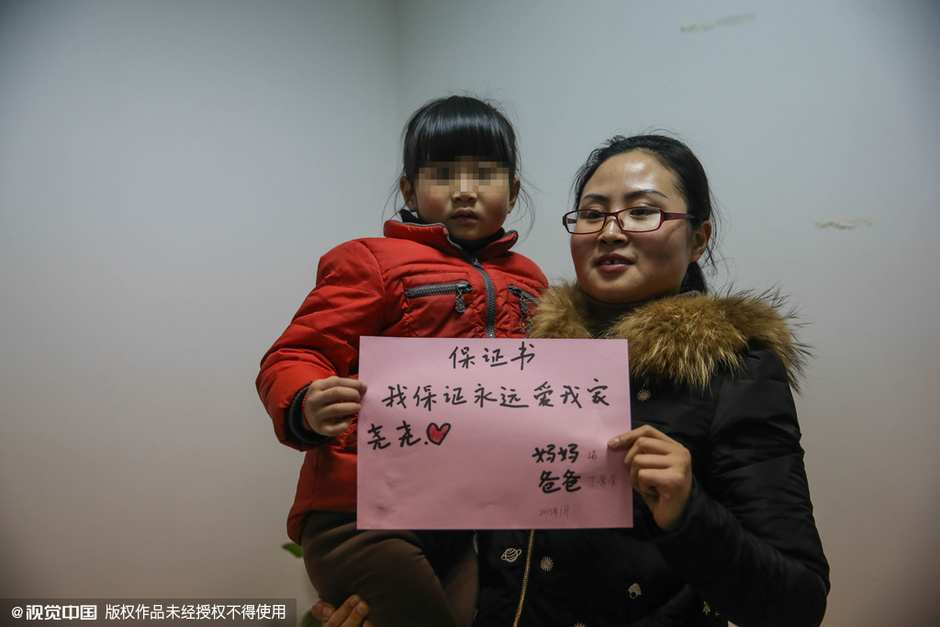 习惯了独生子女的环境,突然要面对一个新生命与自己分享父母的爱以及生活中的一切,客观上会产生一种压力。所谓“同胞竞争”,指的就是通常在年龄稍小的弟弟妹妹出生之后,发生的某种程度的情感紊乱。安徽省合肥市王莉女士在考虑二胎这件事上就特别谨慎。王莉想生个二宝。有一天,她跟女儿尧尧说到这个话题,发现女儿对于生二宝一事较为排斥。仔细想想,王莉才发现女儿是早有这种想法的。王莉妹妹的女儿小果果现在还不到两岁,来王莉家时,王莉喜欢抱抱孩子,每次一抱小果果,尧尧都会走上前问妈妈,“妈妈,你是喜欢果果还是喜欢我?她不是有妈妈吗?为什么要让我的妈妈抱抱?”女儿的问话让王莉发现,尧尧对别的小孩子是十分有敌意的,“她总觉得再有一个小孩,会分了我们对她的爱。”介于女儿这种态度,王莉说虽想要二宝,却一直没有提上日程。为了给女儿一颗定心丸,王莉给女儿写了一份保证书,保证永远爱她。图为2015年1月29日,王莉和女儿尧尧拿着这份特别的保证书合影。
