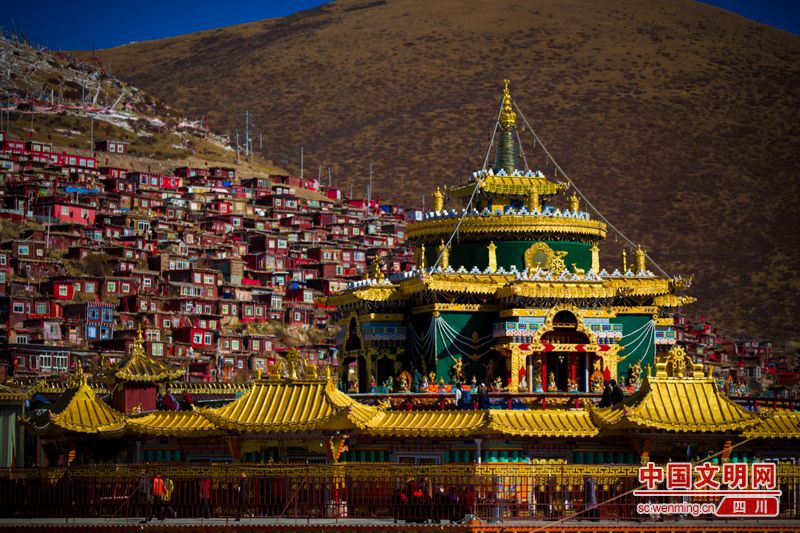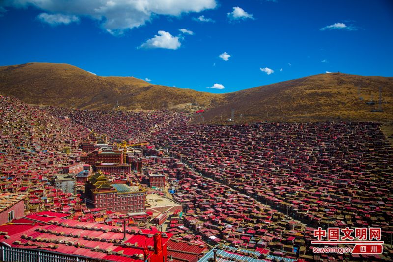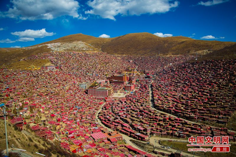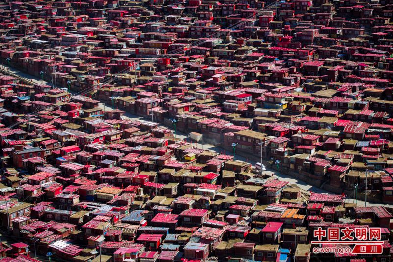 在群山环绕之中,沟里的僧舍,以佛学院的大经堂为中心,密密麻麻搭满了四面的山坡,不计其数的绛红色小木屋,延绵无数,一眼望不到头。这些红色小木屋,是近万名僧侣和尼姑的住所。