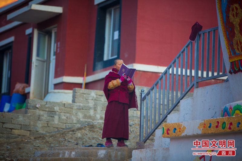 在色达五明佛学院,随处可见正在学习诵经的僧侣学员,空气中充满着祥和气氛。