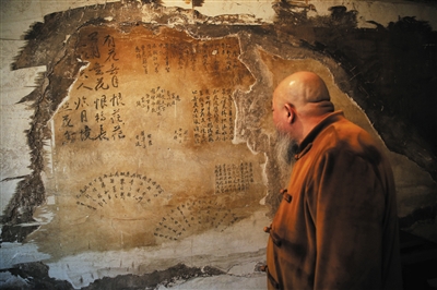 书画大师安云霁正在看曹雪芹故居西屋西墙上的“题壁诗”(复原品,原物已被收藏)。
