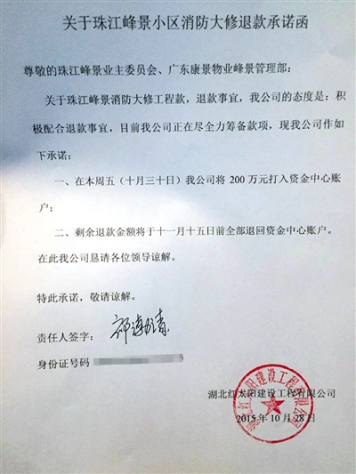 康景公司称,目前这笔钱正在退款中。10月28日,收款单位湖北红太阳建设工程公司(以下简称“红太阳公司”)出具了一份《退款承诺函》,称消防大修工程款将分两笔归还:10月30日前将200万打入资金中心账户,剩余退款金额于11月15日前退回。