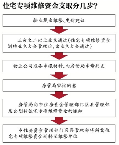 丰台区房管局房屋安全和设备管理科副科长赵新星表示,根据规定,物业公司在准备好申报材料后,向该局申请列支,该局审核同意后,向市住房资金管理部门区县管理部发出划转住宅专项维修资金的通知,最后,再由市住房资金管理部门区县管理部将所需住宅专项维修资金划转至维修单位。