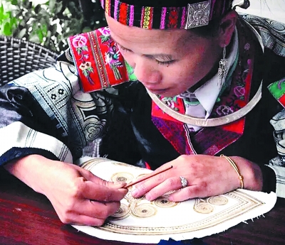项目帮助的苗族妇女在展览现场表演蜡染。本报记者 李韵摄