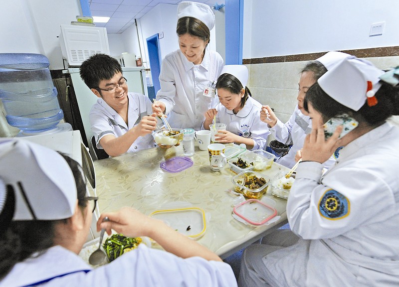 吃饭时女护士总忘不了往男同事的碗里多夹一块肉。
