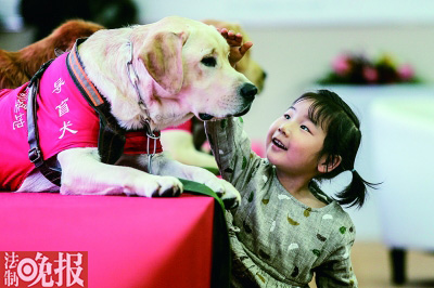 导盲犬性格温顺,在一次展出活动上,一个小女孩抬手抚摸比自己体形还大的导盲犬