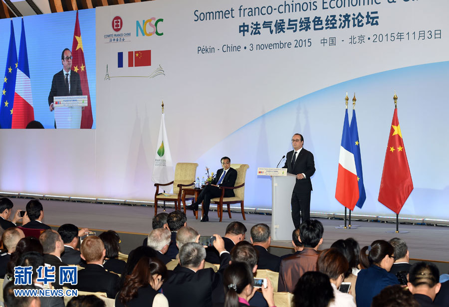 11月3日,国务院总理李克强在北京钓鱼台国宾馆与法国总统奥朗德共同出席中法气候与绿色经济论坛并分别致辞。 新华社记者 饶爱民摄