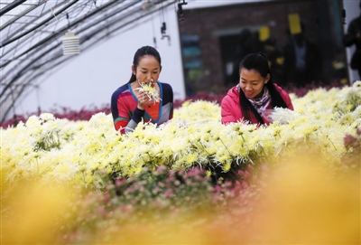 昨日,游客在温室大棚内品尝菊花。第七届西柏店菊花美食节在平谷区大兴庄镇拉开帷幕。50座日光温室大棚,5万公斤食用菊花进入采摘期,即日起至12月31日,市民可到温暖如春的温室大棚观赏五颜六色的菊花,拍照留影,还可采摘鲜菊花,品尝特色菊花茶、菊花点心、菊花饺子、菊花宴等菊系列美食。