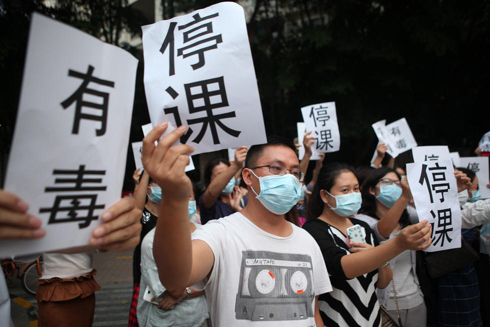 今年暑假期间,北师大南山附小对学校运动场进行了更新改造。近期,有部分家长反映学生出现流鼻血咳嗽等不适症状,怀疑是新修塑胶跑道所致。图为家长举牌请愿。