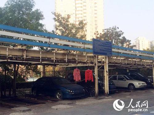位于朝阳区的望京西园四区的两层立体车库,只有零星几辆车停在一层,二层车库完全闲置,有居民还在上面晾起了衣物。车主们大都把车停在了车库前方的空地上。物业称,车库二层已经损坏无法使用,但车库不是物业的财产,所以没办法维修或拆除。(人民网 刘融摄)