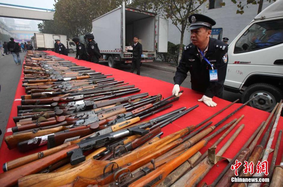 11月5日,河北全省公安机关统一销毁非法枪支活动在邯郸举行。自6月24日河北警方在全省开展收缴枪爆物品集中行动以来,共收缴枪支22230支、子弹417034发、炸药6474公斤、雷管88349枚、仿真枪16697支,查处涉枪涉爆案件3374起,打击处理违法犯罪人员2314人,捣毁枪爆制贩窝点91个。当日,19400多支在此次集中行动中被警方收缴的非法枪支被现场集中销毁。这是河北首次将全省收缴的枪支进行集中销毁,数量为近年之最。图为摆放的密密麻麻的非法枪支。 中新社记者 翟羽佳 摄
