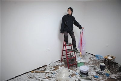 前日,人大静园,自称“坚果兄弟”的一男子在一面刚粉刷过的墙边。数日前,他把被他称为黑中介的电话号码写满了整面墙做展览。新京报记者 王嘉宁 摄