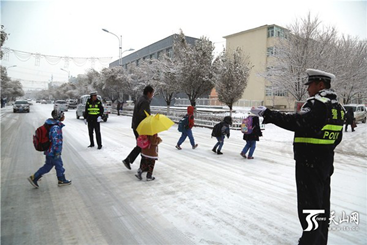 10月29日,新疆巴里坤县普降中雪,气温达到-10度。早上9点,巴里坤县交警大队的交警们站在风雪中,维护交通,护送去上学的孩子们。