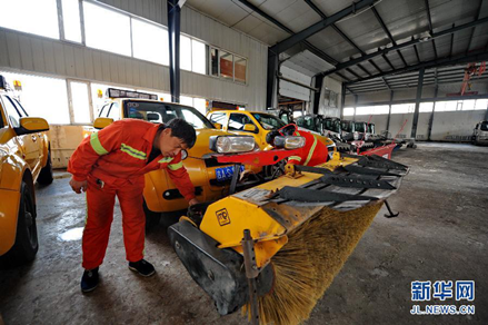 11月4日,在长春市南关区环卫局大型清雪车辆库房,工人在对清雪车辆进行检查。