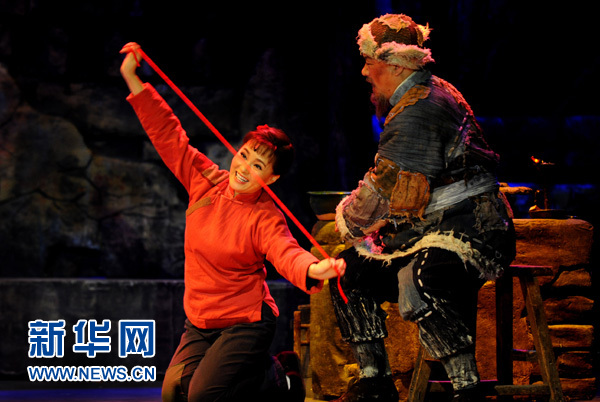 11月6日,扮演喜儿的雷佳(左)表演新版歌剧《白毛女》。当晚,由文化部组织复排的新版歌剧《白毛女》在延安举行全国巡演的第一场演出,此后还将赴太原、石家庄、广州、长沙、上海、杭州、济南、长春巡演,12月15日回到北京中国剧院连演3场,总演出场次19场。《白毛女》是延安鲁艺在新秧歌运动中创作出的中国第一部新歌剧,也是民族歌剧的里程碑,2015年是歌剧《白毛女》在延安首演70周年。新华社记者 陶明 摄
