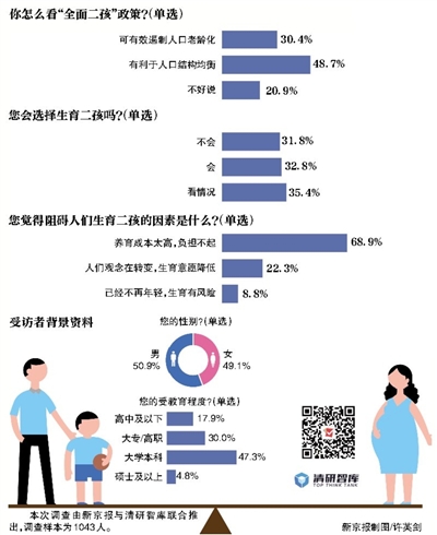 十八届五中全会提出“全面实施一对夫妇可生育两个孩子政策”,标志着持续三十多年的独生子女政策退出了历史舞台。公众对此怎么看?本期“京报调查”(新京报与清研智库联合推出)就此展开调查。