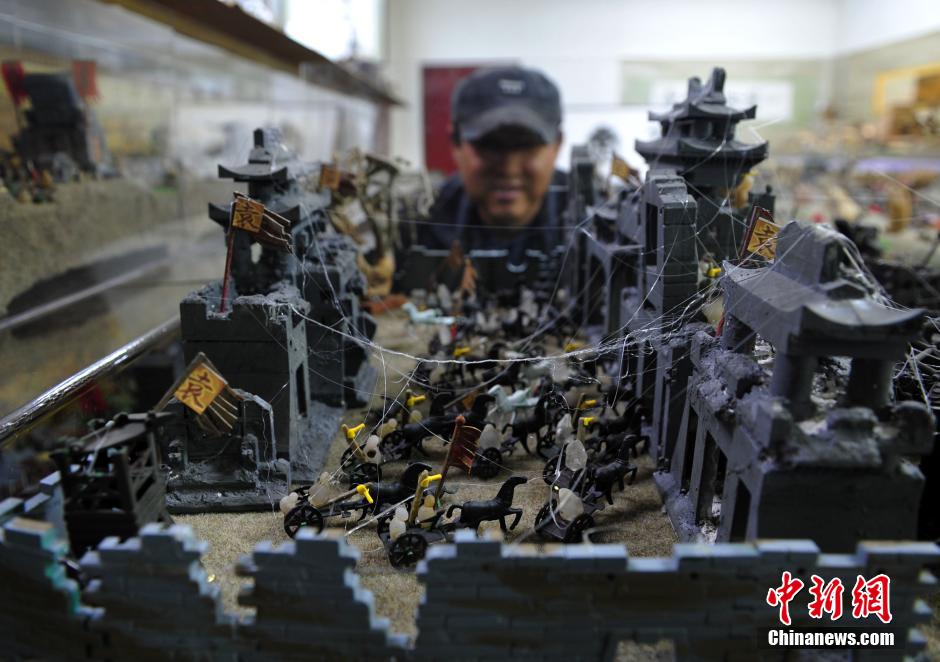 11月6日,河北保定奇石收藏家赵志强正介绍他的爱作,一件用万余块奇石组成的石头版《三国演义》。赤壁之战、官渡之战、夷陵之战三大战役栩栩如生的一一“石现”在沙盘上;城楼、沟壑、大小战船,车马和兵阵在战场上随处可见。赵志强表示,这套“石说三国”从构思到创作花费2年时间,其将军、士兵均选用戈壁石、新疆彩玉、金丝玉、火山岩和天然玛瑙等多种人形奇石11000余块组成。图为赵志强欣赏爱作。中新社记者 翟羽佳 摄