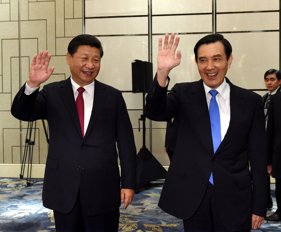 11月7日,两岸领导人会面在新加坡香格里拉大酒店举行。这是习近平、马英九在挥手致意。 新华社记者饶爱民摄