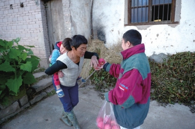 看到他递来苹果,村人尴尬地笑笑,婉拒了。