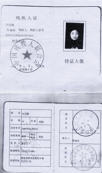 小梅的残疾人证及郧西县法院外景。此前,小梅在郧西县法院起诉离婚获调解,家人认为小梅患有精神病无民事行为能力,法院不应受理,要求恢复两人婚姻关系。小梅家人供图
