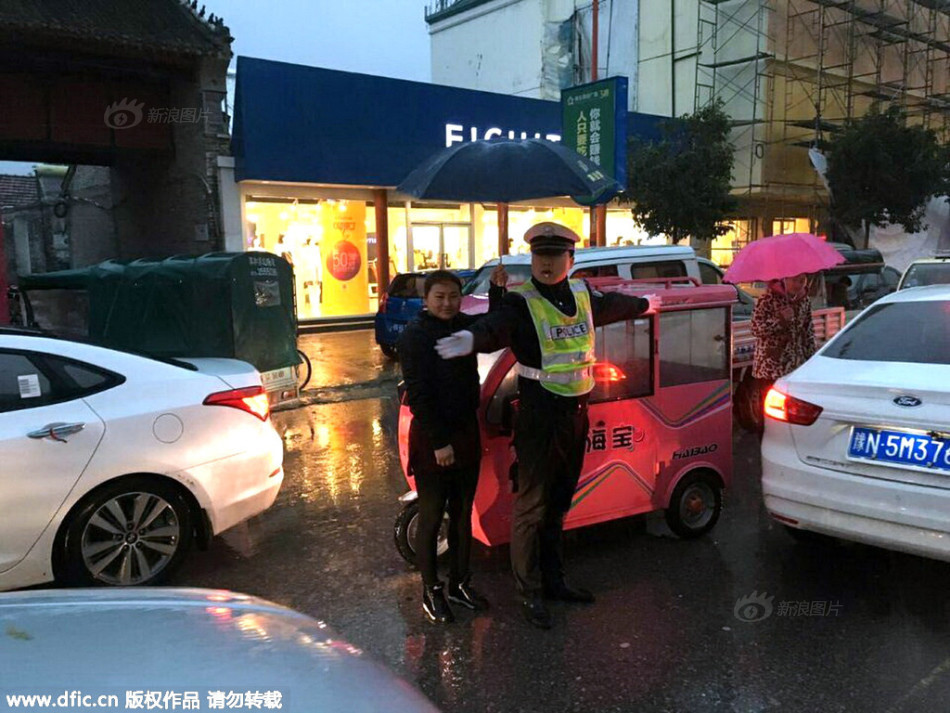 11月9日报道,11月6日晚上,河南虞城县,天下着大雨,一交警在雨中指挥交通时,一名路过的女子上前为交警撑伞。交警再三拒绝,这名女子还是一直打着伞,半小时后,雨小了,女子才离开。供图:东方IC