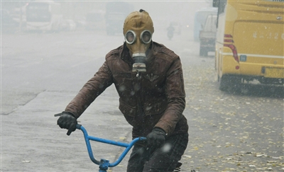 8日,沈阳市民戴着防毒面具出行。 图/CFP