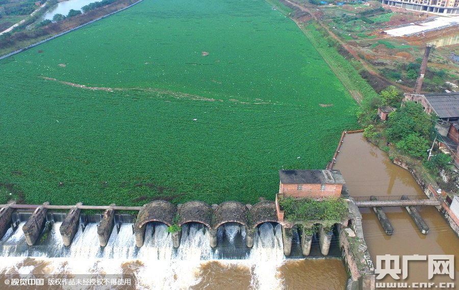 2015年11月09日,湖南省衡阳市衡阳县,由于前段时间的暴雨,蒸水河上游的水葫芦随着洪水飘移到西渡河坝及英陂电站水域,数百米宽的河道几乎成了“绿草带”。