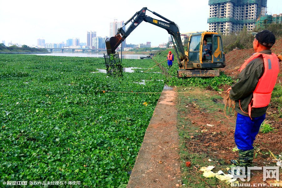 2015年11月09日,湖南省衡阳市衡阳县环卫处水上环卫队也在组织人员不停地打捞水葫芦,并租赁经过改装的大型挖机对河道边上的水葫芦进行处理。