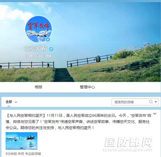 中国空军新闻发言人申进科上校11月10日发布消息说,在空军成立66周年之际,以传播空天文化、服务社会公众为主旨的“空军发布”官方微博、微信公众号开通运行。