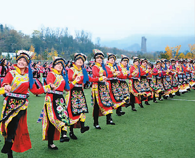 农历十月初一是羌历新年。11月11日上午,位于汉江源头的陕西省宁强县体育场内,万余人齐聚于此载歌载舞,共同庆祝羌历新年。