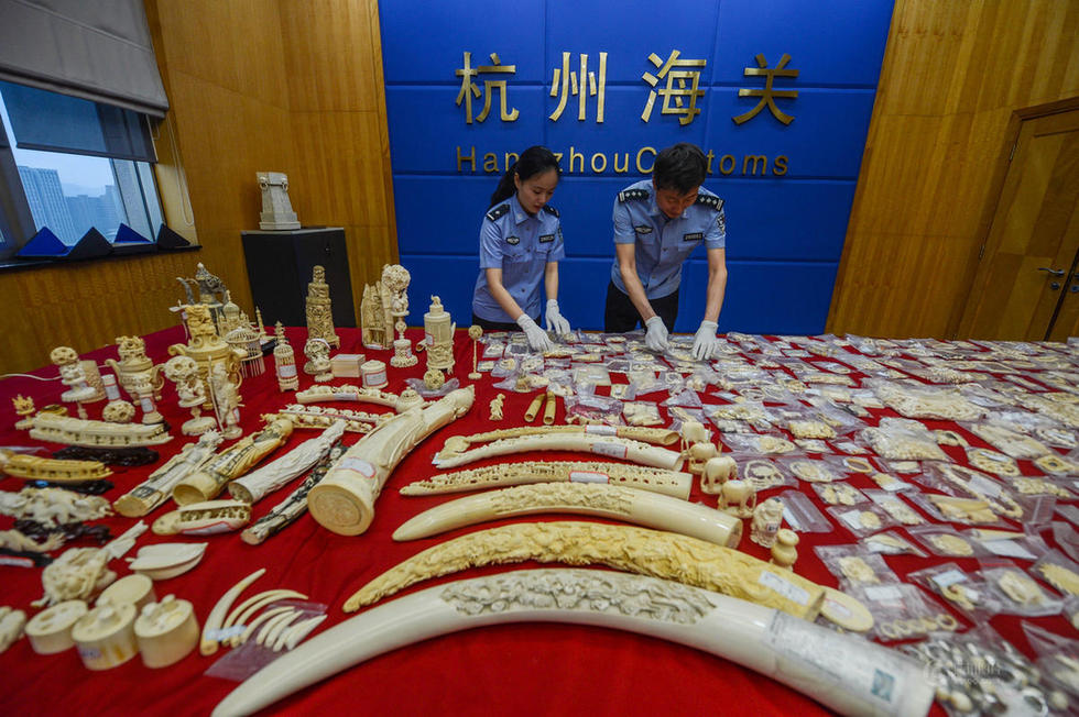 我国各地频频打击非法制售象牙案件,今年5月份,杭州海关宣布,自2014年6月海关总署部署开展旨在保护生物多样性、打击象牙等濒危动植物制品走私的“守卫者”行动以来,杭州海关已先后破获利用进出境旅检、邮递渠道走私濒危动物制品大案,共查获走私象牙270余公斤、犀牛角近9公斤,其中包括不少精致的象牙工艺品。图为5月18日,杭州海关工作人员清点查获的走私象牙工艺品。新华社记者 徐昱 摄