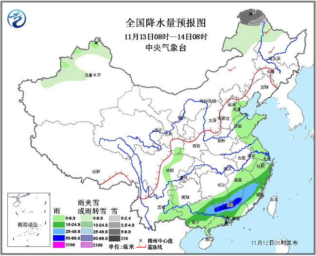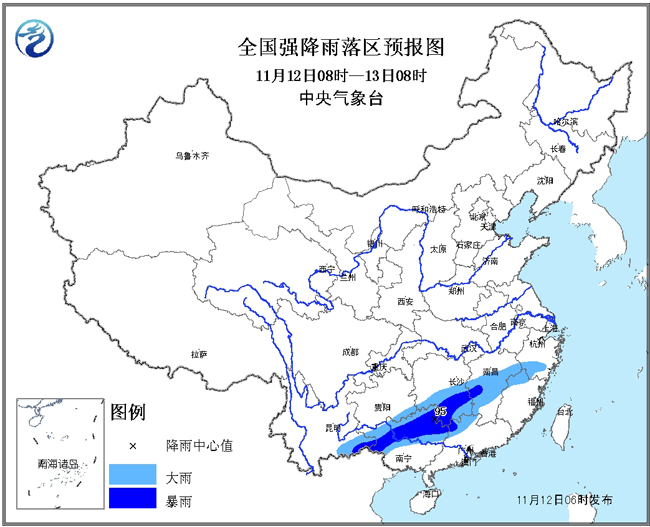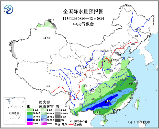 12日08时至13日08时,新疆西北部、山西中部等地有小到中雪或雨夹雪;西南地区东部和南部、陕西中北部、华北西部、黄淮大部、江汉、江淮、江南、华南大部等地有小到中雨,其中广西中北部、广东北部、湖南中南部、江西中南部、浙江南部、福建西北部等地的部分地区有大到暴雨(50~95毫米)。