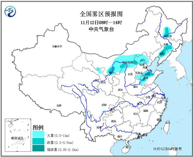 预计,今天早晨到上午,北京、河北西北部和南部、山东西北部、山西北部、内蒙古河套地区、宁夏北部、黑龙江西南部、吉林东南部、辽宁中部等地有能见度不足1公里的大雾,其中,部分地区有能见度不足500米的浓雾,局地有能见度不足200米的强浓雾。中央气象台11月12日06时继续发布大雾黄色预警。