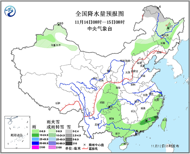 13日08时至14日08时,新疆西北部、内蒙古东北部、黑龙江西北部等地有小到中雪或雨夹雪,其中内蒙古东部偏北地区、黑龙江西北部等地的局地有大雪;浙江东部和南部、福建西部和北部、江西南部、湖南南部、广西中部和东北部、广东中北部等地的部分地区有中到大雨,其中,广西东北部、广东北部、江西南部等地局地有暴雨(50~90毫米)。内蒙古中东部、东北地区西部等地有4~6级风。