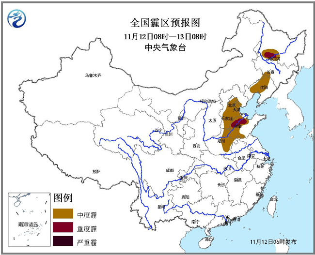 预计,12日08时至13日08时,北京东南部、天津、河北中南部、河南东北部、山东西部、辽宁中部、黑龙江西南部等地的部分地区有中度霾,其中,山东西北部、黑龙江西南部等地的局部地区有重度霾。中央气象台11月12日06时继续发布霾黄色预警。