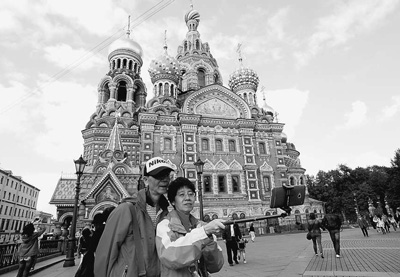 为吸引更多中国游客,俄罗斯推出便利化的签证政策,旅行社也专门设计了红色旅游产品。图为今年9月4日,在圣彼得堡市中心,中国游客拍照留念。