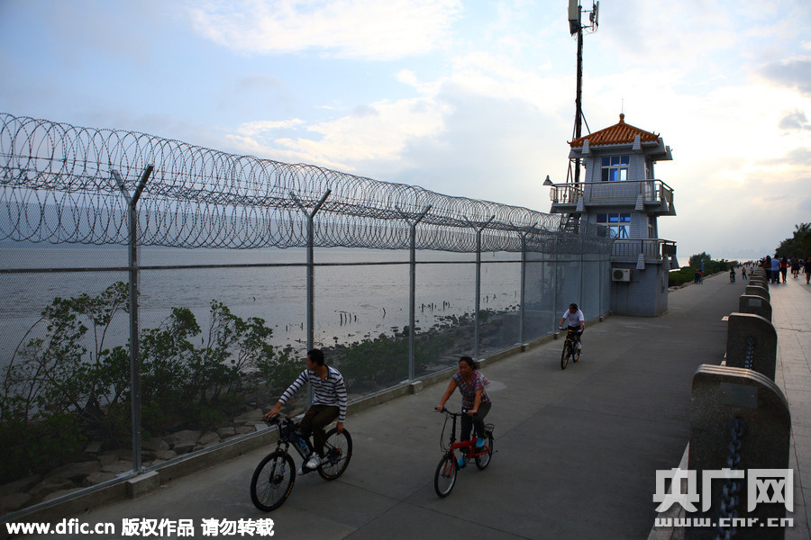 铁丝网建在边防巡逻道外侧,起于滨海大道转入边防巡逻道处,终于红树林自然保护区边防巡逻道边防岗亭处,长约500米,高四五米。