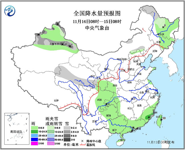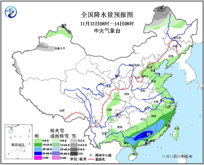13日08时至14日08时,新疆北部和西部、内蒙古东北部、黑龙江西北部等地的部分地区有小雪或雨夹雪,其中阿勒泰、内蒙古东北部的部分地区有中到大雪;河北中部、黄淮东部、江淮东部、江南东部和南部、华南大部等地有小到中雨或阵雨,其中,广西东部、广东北部和西部、江西南部、福建西部等地的部分地区有大雨,局部暴雨(50~80毫米)。