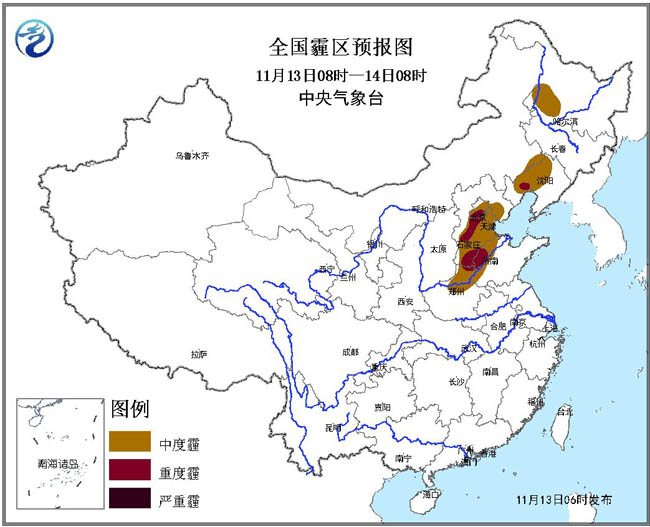预计,13日08时至14日08时,北京南部、天津、河北中南部、河南北部、山东西部、辽宁中部、黑龙江西南部等地的部分地区有中度霾,其中,北京南部、河北中南部、山东西部等地的局部地区有重度霾。中央气象台11月13日06时继续发布霾黄色预警。