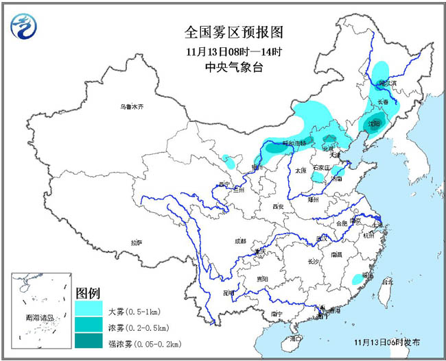 预计,今天早晨到上午,北京、河北北部和南部、山东西北部、山西北部、内蒙古河套地区、宁夏北部、黑龙江西南部、吉林中部、辽宁中部等地有能见度不足1公里的大雾,其中,部分地区有能见度不足500米的浓雾,局地有能见度不足200米的强浓雾。中央气象台11月13日06时继续发布大雾黄色预警。
