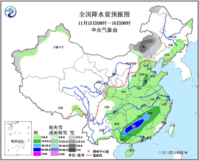 15日08时至16日08时,新疆北部和西部、内蒙古中东部、河北北部、黑龙江西北部、甘肃南部等地有小雪或雨夹雪,其中内蒙古中部偏东的部分地区有大雪(5~8毫米)。东北地区东部、华北大部、黄淮、江汉、江淮、江南、华南、西南地区东部、云南东南部、西北地区东南部、台湾东部等地有小到中雨或阵雨,其中江西中部偏西地区、湖南南部、广西东北部等地的部分地区有大雨,局部暴雨(50~90毫米)。内蒙古中东部、东北地区西部有4~6级风。