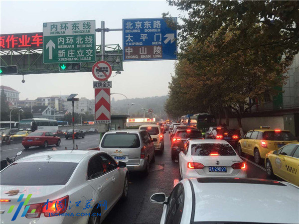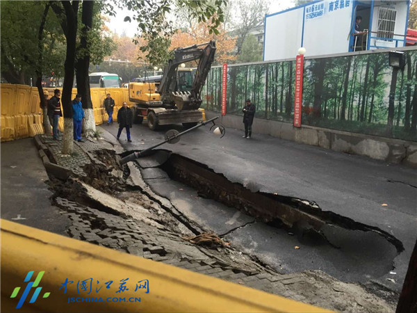 11月16日清晨6点多,在南京玄武区北京东路40号门前突然一声巨响,路面塌陷的同时一根交通标志杆倒下。